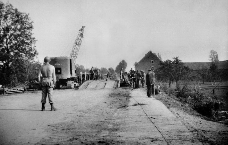 Here’s a Bailey Bridge under construction by engineers. Unfortunately, the notes on the envelope containing this negative did not match what was on the negatives inside. I’m pretty sure this is Biagio’s Engineering unit though.
