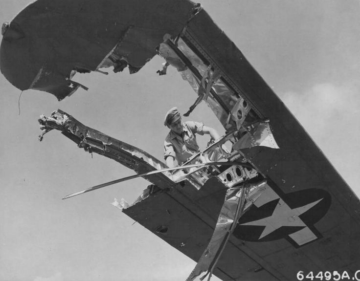 Crew member examines wing of a Consolidated B-24 “Liberator” which was badly-damaged during pre-invasion raid over Iwo Jima. Marianas Islands [Via]