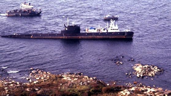 The boat was stuck on the rock for nearly 10 days. On 5 November it was hauled off the rocks by Swedish tugs and escorted to international waters where it was handed over to the Soviet fleet. (via)