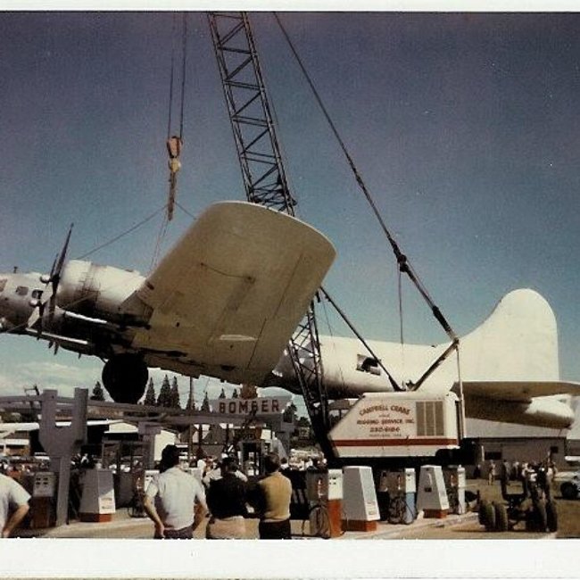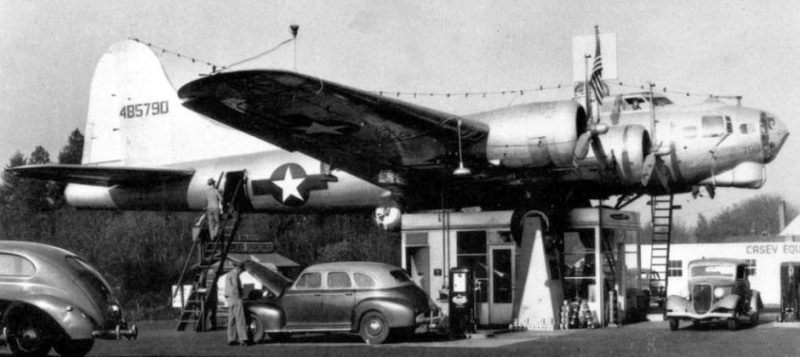 The B-17 had been used as a roof for the gas station on McLoughlin Boulevard in Milwaukie for more than 60 years, and had become a local attraction. The owner of the gas station bought the B-17 after his friends made him a bet that he couldn’t use abomber aircraft as a roof for his gas station. He paid around $14,000 for the bomber and arranged for a pilot to fly it to Oregon in 1947. Cranes lifted the bomber into place, where it has remained ever since.