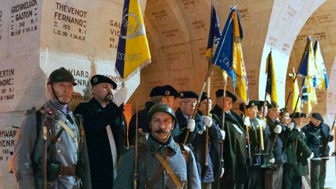 The Verdun memorial was specially renovated for this centenary commemoration. Three hundred people dressed in WWI German and French uniforms and they marched down the lane to the exact spot where the battle started at dawn, 100 years ago to the day. The sound of shell fire was played to re-enact the sounds of the shells fired on that first day of the battle.