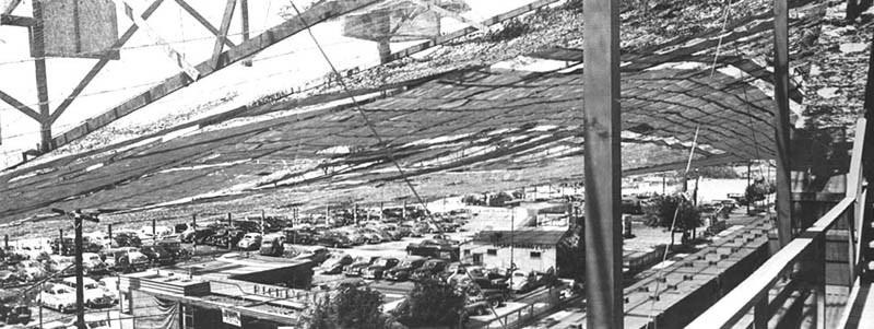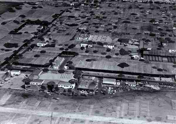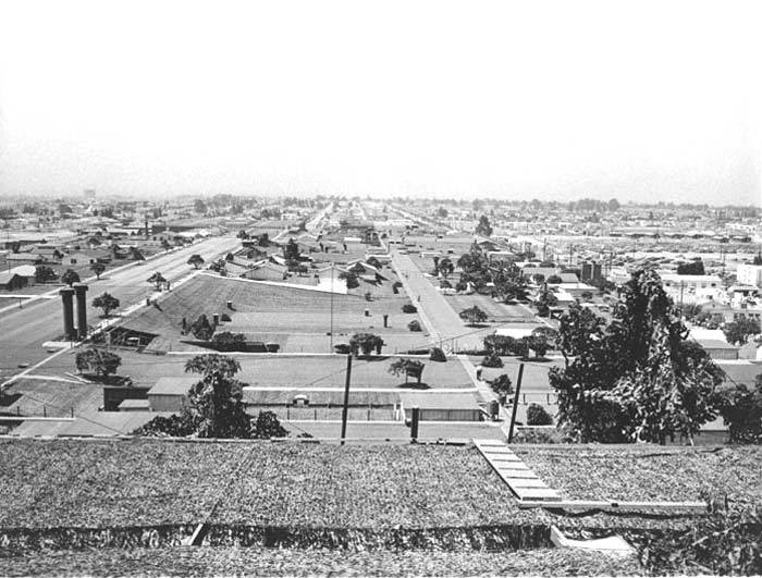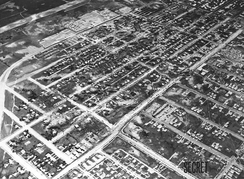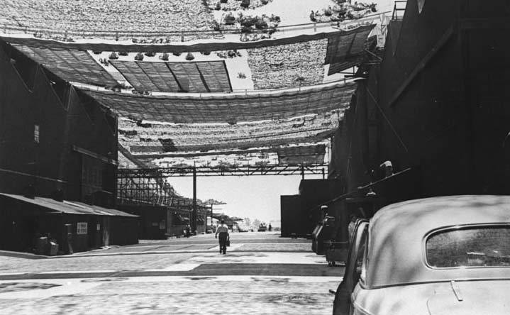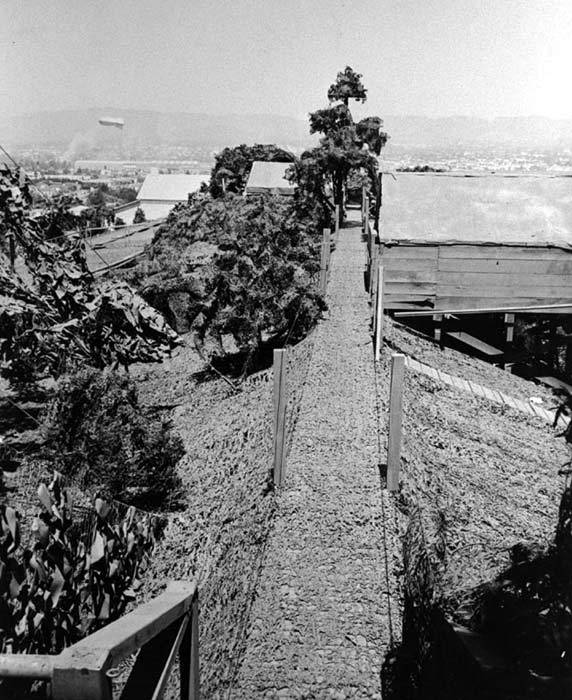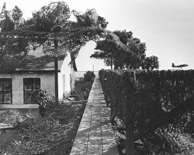 The Lockheed-Vega plant, in Burbank, was hidden completely below a complete blanket of cover. It gave the appearance of a suburban area, rubber vehicles and quaint, peaceful neighborhoods were painted on canvas. Hundreds of fake shrubs and trees were placed around the area to make the area look more three-dimensional.