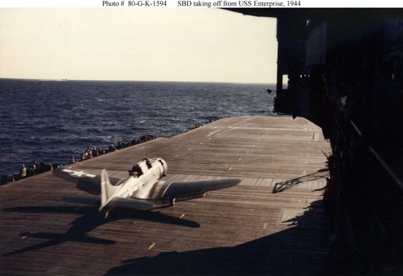 Douglas SBD Dauntless scout bomber Takes off from USS Enterprise (CV-6) during operations in the Pacific Ocean, circa early 1944. The original Kodachrome color transparency was received by the Naval Photographic Science Laboratory on 29 May 1944. Official U.S. Navy Photograph, now in the collections of the National Archives.U.S. Navy Grumman FM-2 Wildcat fighter of composite squadron VC-84 launching from the escort carrier USS Makin Island (CVE-93) in the Pacific in 1945.