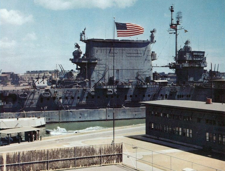 The U.S. Navy aircraft carrier USS Saratoga (CV-3) moored at Ford Island in Pearl Harbor, Hawaii (USA), circa in June 1945