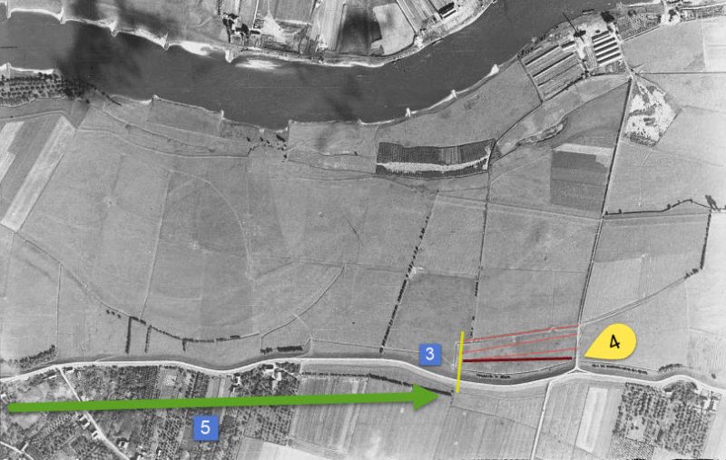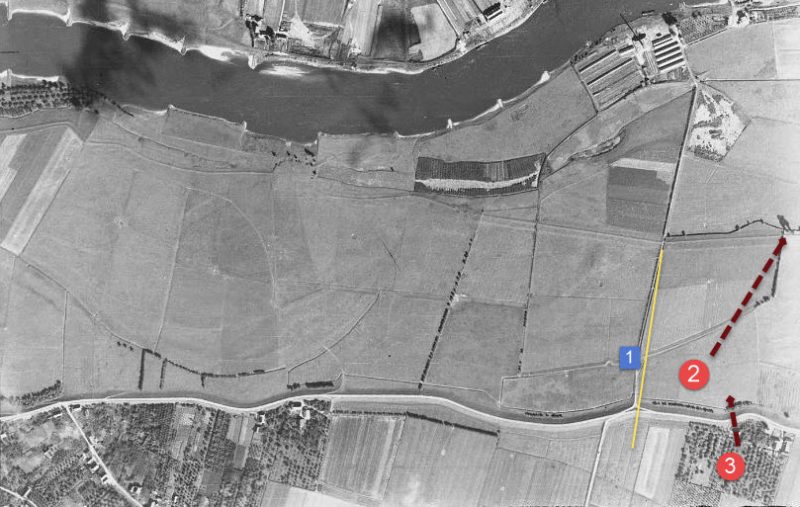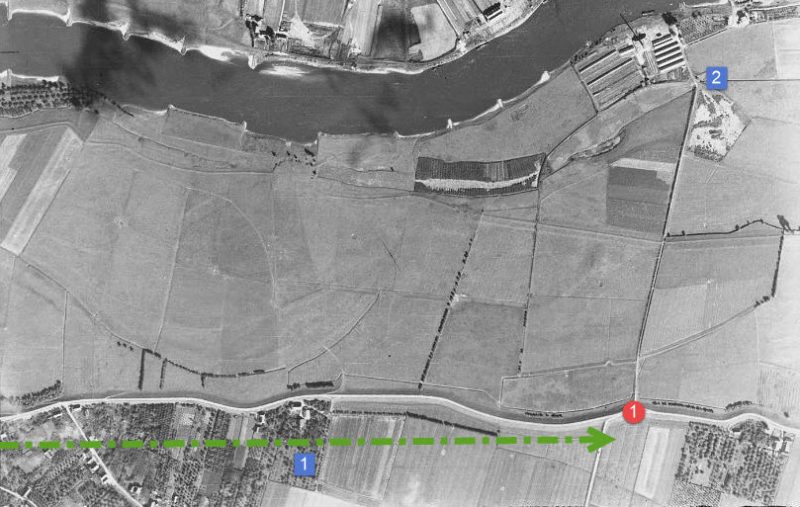 They made their way along the dike on the South side (I assume), when the got near the crossroads (red 1) Sgt Youman ordered Lesniewski to climb to the top of the dike.