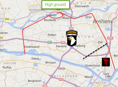 On the North bank of the Rhine is high ground overlooking the Island, after the 1st Airborne Division withdrew from the Oosterbeek area this is now firmly in German hands.