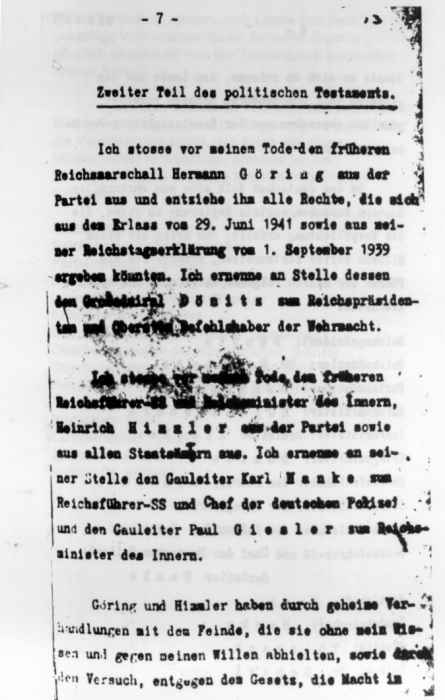 In his last days, Hitler became disenchanted with his top men, Goring and Himmler, and penned a will that would name Donitz as President and Supreme Commander of the Armed Forces and Joseph Goebbels as Chancellor and Head of Government.