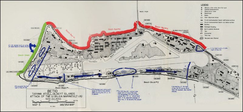 The focus of both the Japanese defenders and the Americans attackers was Betio, which had been the British headquarters. Just two miles long and a few hundred yards wide, this flat island guarded the only entrance to the lagoon, and had a pier for small boats, though this could only be used at high tide. Having built their main airfield in the region there, the Japanese forces were concentrated on this spot.