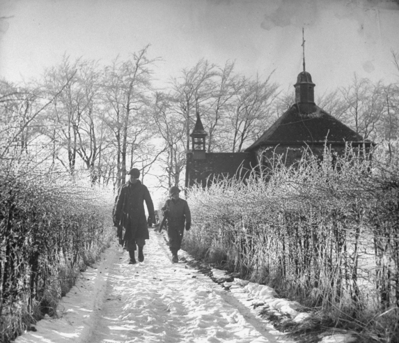 1st Army GIs search for German paratroopers during the Battle of the Bulge, December 1944.