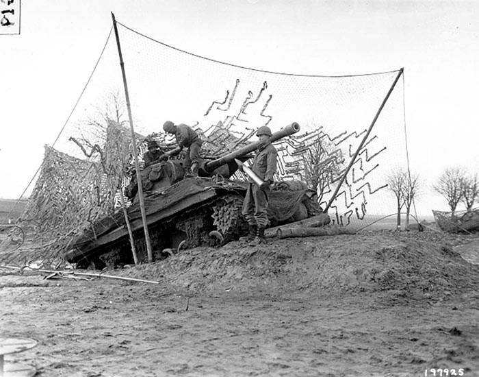 Btry C, 702 TD Bn., 2nd Armored Division, tank destroyer on dug-in ramp has plenty of elevation to hurl shells at long range enemy targets across the Roer River.