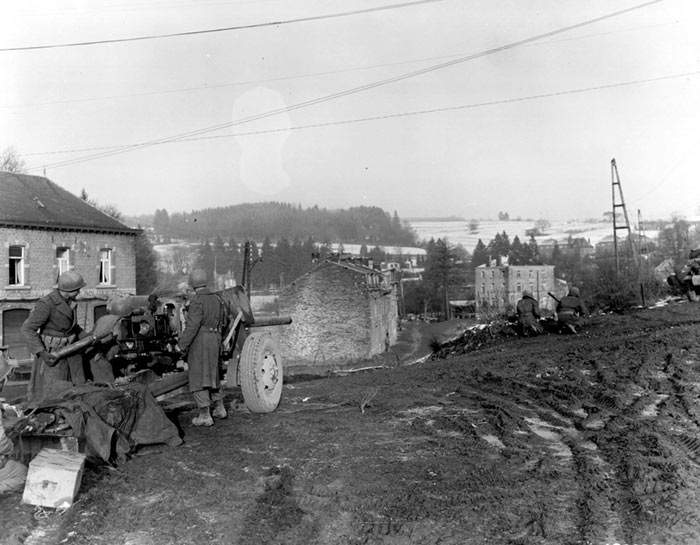 Members of the 630th Tank Destroyer Battalion, Company “B”, who lost their vehicles during advancement to Belgium, take Infantry positions on a hill covering an approach in Wiltz, Bastogne, Belgium (12/20/44)
