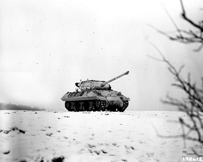 Dudelange, Luxembourg. Painted white to blend with snow-covered terrain, an M-36 tank destroyer crosses a field. (3 Jan 1945)