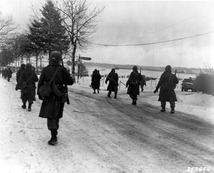 U.S. troops of the 28th Infantry Division, who have been regrouped in security platoons for defense of Bastogne, Belgium, march down a street. Some of these soldiers lost their weapons during the German advance in this area. Bastogne, Belgium (12-20-44)